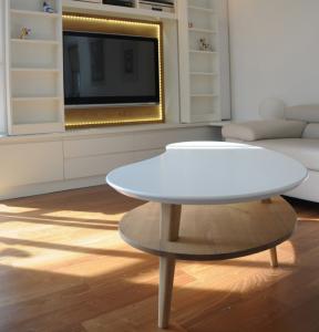 Beine und Zwischenebene Kirschbaum geölt 18° geschrägt, Tischplatte 38mm MDF Weiss lackiert