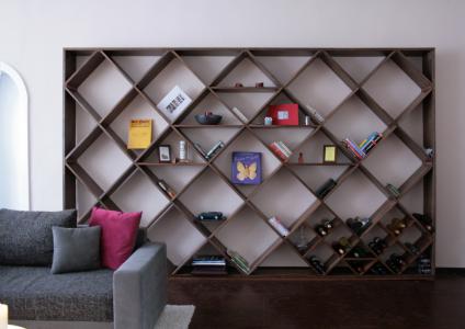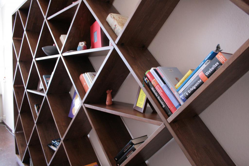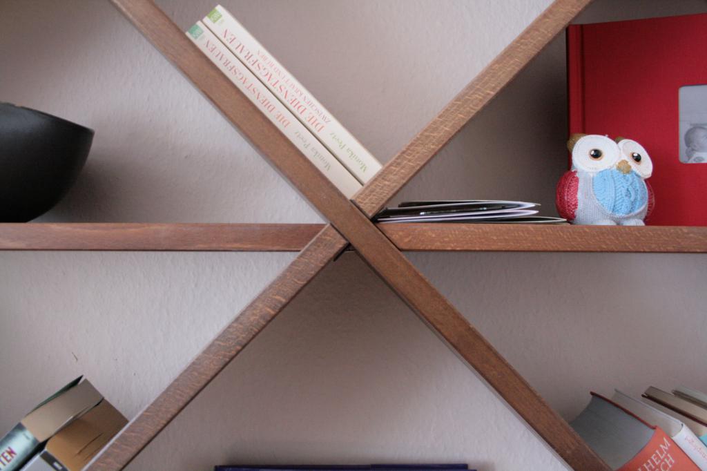 Jede Ordnung beginnt mit einer Idee, so auch dieses Regal mit schräg gestellten Fächern.