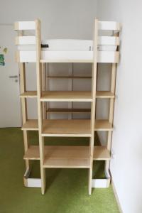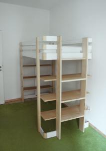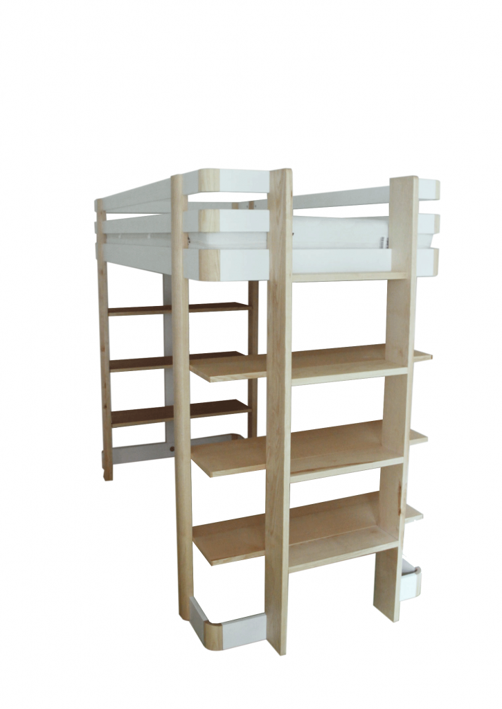 Kinderbett aus Esche und lackiertem Vollholz. Ecken in Massiv Esche gerundet. 90x200 Liegefläche oben schlafen unten spielen - OSUS