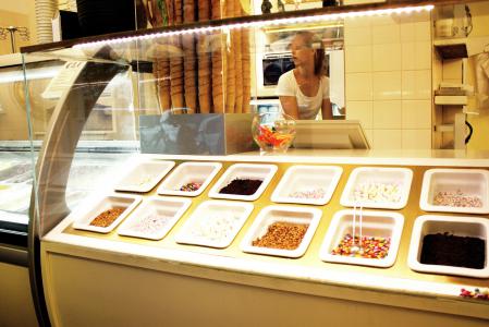 Toppingvitrine und Podest zum Genießen.